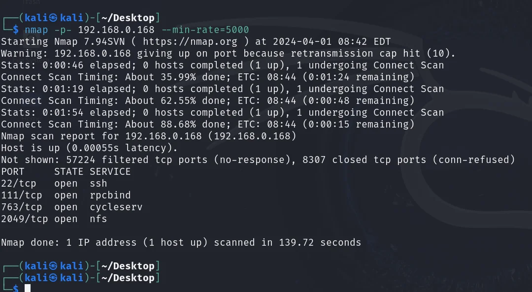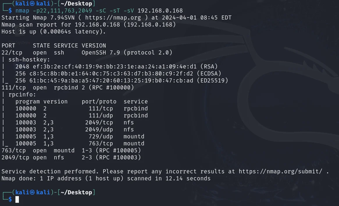 nmap -p22,111,763,2049 -sC -sT -sV 192.168.0.168