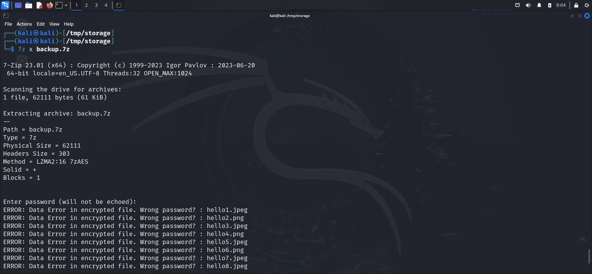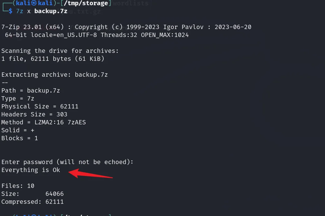 cat /usr/share/wordlists/rockyou.txt|while read line; do 7z e backup.7z -p"$line" -oout; if grep -iRl SSH; then echo $line; break;fi;done