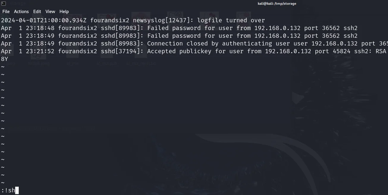 发现 less 可以以root 身份 编辑 authlog ,那么 less 命令可以按v进入vi编辑器后,输入:!sh应该就能够以root身份启动shell了