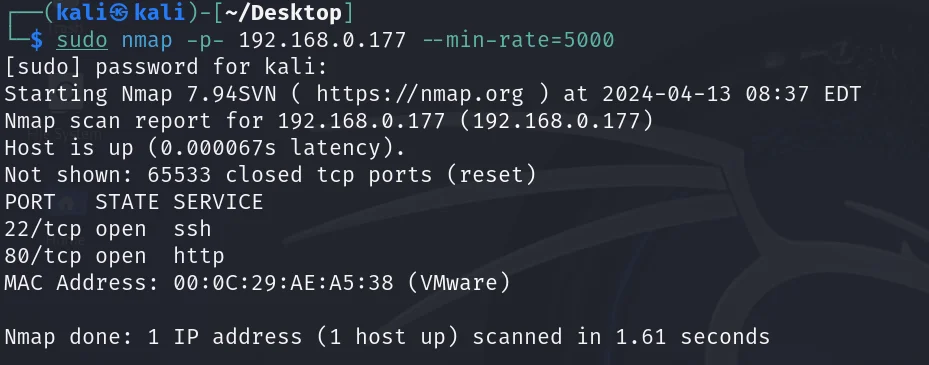 sudo nmap -p- 192.168.0.177 --min-rate=5000