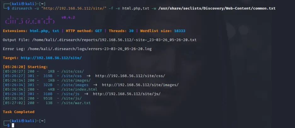 dirsearch -u "http://192.168.56.112/site/" -f -e html.php,txt -w /usr/share/seclists/Discovery/Web-Content/common.txt