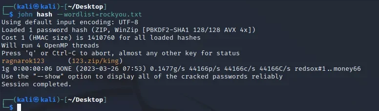 gunzip rockyou.txt.gz zip2john 123.zip > hash