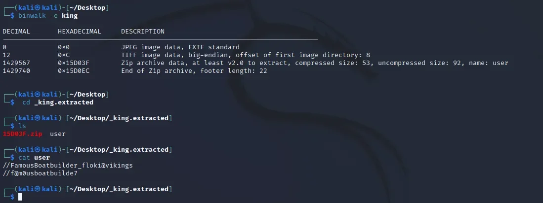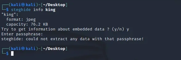 for i in $(cat "rockyou.txt"); do steghide extract king -p $i; done