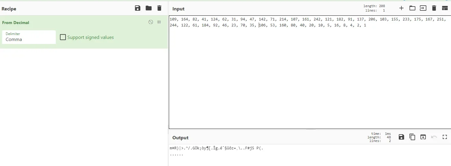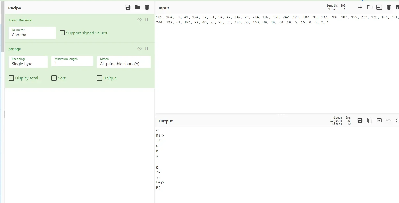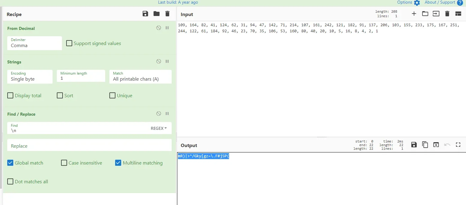 print(c) [109, 164, 82, 41, 124, 62, 31, 94, 47, 142, 71, 214, 107, 161, 242, 121, 182, 91, 137, 206, 103, 155, 233, 175, 167, 251, 244, 122, 61, 184, 92, 46, 23, 70, 35, 106, 53, 160, 80, 40, 20, 10, 5, 16, 8, 4, 2, 1]